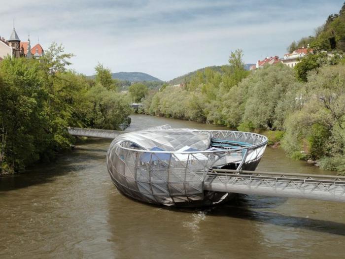 Закинув вещи и оставив детей исследовать квартиру, мы отправились немного осмотреть окрестности. На набережной обнаружили необычный мост, который носит название Муринзель. Сначала попадаешь на его открытую часть, которая выглядит, как обычный мост, за исключением неоновой «космической» подсветки. В первый момент нам показалось, что мост качается. Самой реки в темноте не видно, но слышен просто оглушающий непрекращающийся шум воды где-то внизу. Ощущения так себе, скажу я вам… Пройдя вперёд, мы очутились в центральной части моста, которая выглядит как островок посередине реки. Здесь расположено кафе и амфитеатр под открытым небом. Ну и дальше опять начинается открытая часть, которая выводит на противоположный берег.