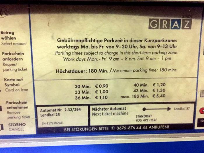 Въехав в Грац, мы целиком и полностью доверились навигатору, который, не моргнув глазом, вывел нас на пешеходную улочку, где, собственно говоря, и находился нужный дом. Вся беда была в том, что попасть к этому дому можно было только протиснувшись между столиками уличного кафе. Пришлось развернуться и поискать другие пути-дороги. Навернув кружок по району, нашли место на набережной бурной реки Мур. Парковка, конечно же, оказалась платной, да ещё и больше трёх часов стоять нельзя, но, зато, находилась всего в паре шагов от дома. Так как на ночное время суток правила парковки не распространялись, мы со спокойной душой оставили здесь машину до 9 утра и пошли разбираться со входным замком.