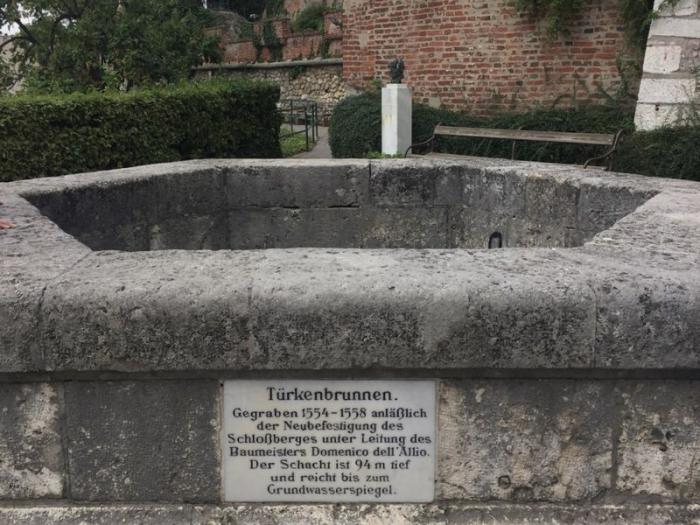 Также, мы обнаружили каменный колодец. Установленная на нем табличка сообщила нам, что построен он был в 1554-1558 годах, имеет глубину 94 метра и называется Турецкий колодец. Во время осады крепости из него брали воду.
