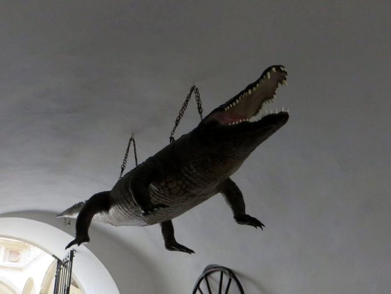 В арке, ведущей ко входу в ратушу на цепях подвешено чучело крокодила, которого в прежние времена жители считали драконом.