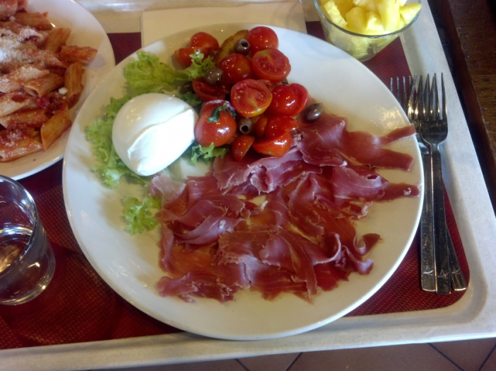 Забегая немного вперёд, скажу, что набор из этих 3 блюд дополняется ещё сыром и пиццей. И на этом итальянская кухня заканчивается. Под конец нашего пребывания в Италии все мечтали о горячем супе или о картошке с каким-нибудь мясом.