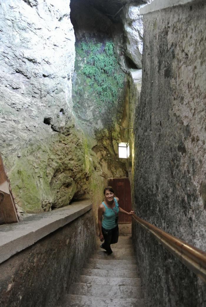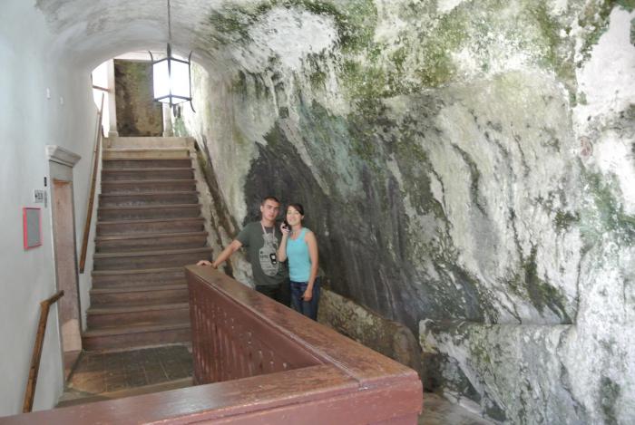 Прилепленный к скале замок был задуман как оборонительное сооружение и прекрасно справлялся со своим предназначением. Он состоит из двух частей: шестиэтажного здания и пещерных залов, которые соединены с построенной частью посредством навесного моста. Если верить аудиогиду, время практически не тронуло замок, и сейчас он выглядит так же, как в средние века.