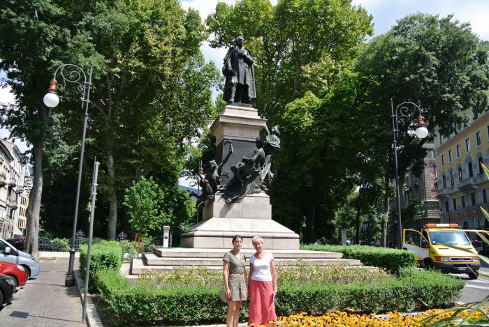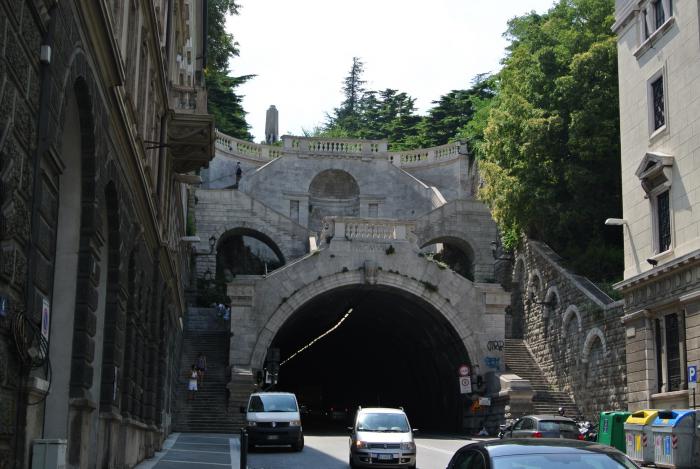 Это не совсем обычный трамвай. Он был создан как пригородный маршрут от Триеста до горной деревни Вилла Опичина. Сейчас это туристический маршрут. Когда он взбирается наверх по склону холма, его толкает маленький локомотив, чего мы так и не увидели. Согласно расписанию, трамвай должен отправляться каждые 20 минут. Просидев на этой станции около часа и потеряв надежду, спросили у местного товарища, ходит ли вообще этот трамвай и соблюдается ли расписание. Да, ответил тот, но прождать можно пол-дня. Хорошо, что билеты не купили… зато встретили вот такую статую.