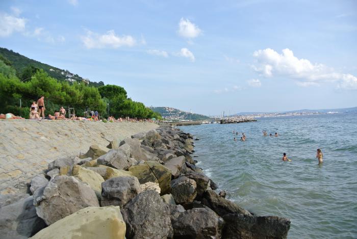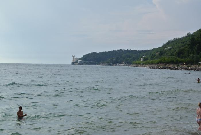 Перед поездкой мы читали про различные пляжи в этих местах. Так вот один из пляжей Триеста расположен на набережной Мирамаре, идущей от центра города до одноимённого замка. Парковка вдоль неё бесплатная и сам пляж тоже. По мере того, как мы спускались в город, создавалось впечатление, что все его жители едут к морю: на велосипедах, мотоциклах, машинах. По сути, набережная Мирамаре и есть сам пляж, народ загорает прямо на мостовой, там же оборудованы и душевые, есть лежаки (всё бесплатно). Для спуска к морю построены лестницы. Море очень чистое, такого насыщенного синего цвета, и совершенно прозрачное. Дно видно, но до него не достать, не нырнув. Одним словом, насыщенный экскурсионный день завершился прекрасными водными процедурами в сочетании с солнечными ваннами.