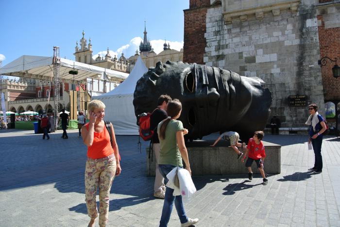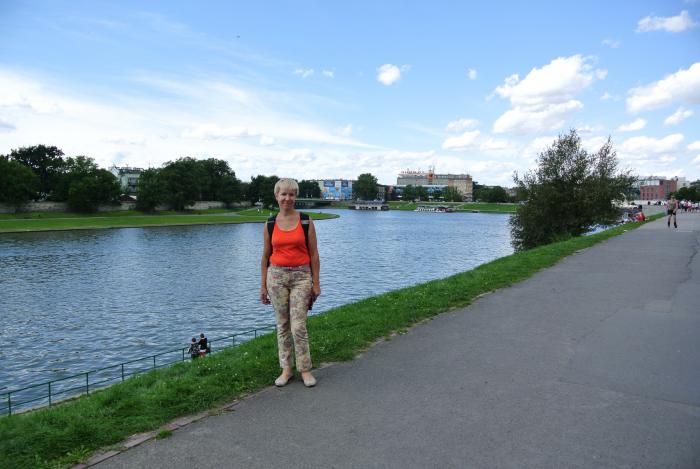 На берегу Вислы.На обратном пути прошли у подножия холма Вавель и при выходе на набережную Вислы увидели дракона, который периодически извергал пламя из пасти (к радости толпы детей, которая толпилась у скульптуры).