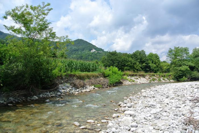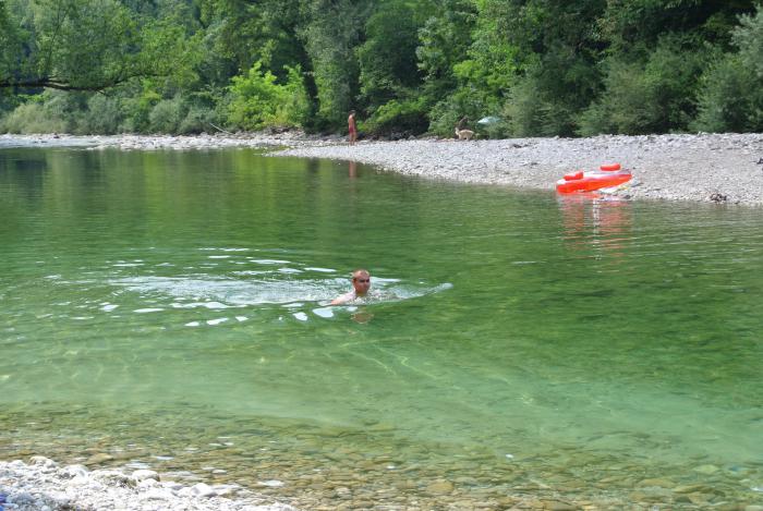 Горная река, окружённая зеленью, здесь делала поворот, замедляя течение. Тем самым образовался своего рода водоём, который всё — таки прогревался и народ там активно купался, несмотря на холодную воду. Напротив пляжа на горе был виден замок, может быть уже на словенской территории?