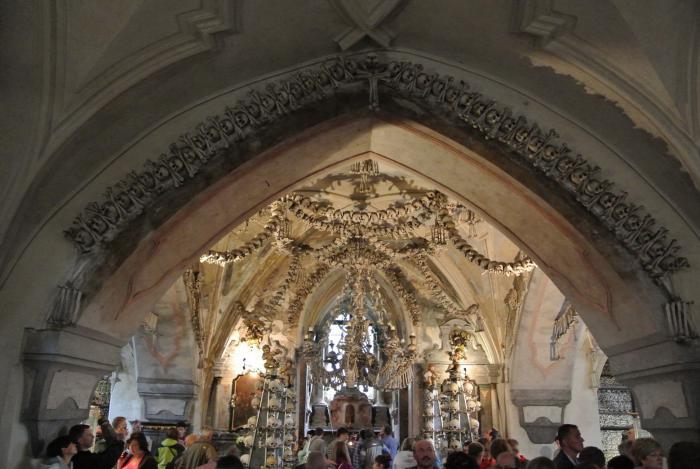 Сначала мы отправились в ту часть города, которая называется Седлец, чтобы посетить Костницу. Костница, а точнее Часовня Всех Святых, интерьер которой создан из человеческих останков, вызвала противоречивые чувства. Но, спору нет, место уникальное. Привожу две фотографии, хотя не уверена, нужно ли.