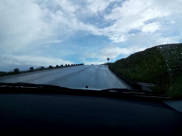 Порадовало то, что народу на дороге было немного (видимо из-за погоды), поэтому на смотровых площадках было свободно. Уже ближе к самой верхней точке подъёма, выехав из тоннеля, оказались в «молоке», не было видно вообще ничего, да ещё вновь начал идти снег.
