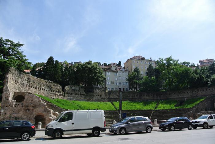 В конце концов, вся площадка превратилась в одно большое застолье, на сцене появился оркестр и начался танцевальный вечер под живую музыку. Народ танцевал очень активно, причём и стар и мал, Саша с Ляйсан тоже поучаствовали. Мы в меру возможностей (обоюдных) общались с соседями по очереди, по столу, они были очень удивлены, встретив русских в итальянской глубинке. Выступавший певец был, видимо, популярен у местной публики, потому что многие ему подпевали. Ещё на этой фесте была выставка кукол, часть которой была посвящена кукле Барби в вязаных нарядах. Домой вернулись ближе к полуночи в приподнятом состоянии.11.08.2014. Сегодня у нас запланировано посещение Триеста, сначала гуляние, потом купание. Триест – административный центр провинции Фриули-Венеция-Джулия, портовый город, расположившийся по берегам одноимённой бухты Адриатического моря. Бухта достаточно далеко вдаётся вглубь берега, берега её крутые, поэтому город расположен в «чаше». Дорога при подъезде к Триесту спускается с холмов и взору открывается удивительно красивая панорама всей бухты и города. Все улицы очень узкие, спускаются к центру достаточно круто, забиты машинами, поэтому возникли проблемы с парковкой. Сначала мы заехали на большую парковку, которая была предназначена для студентов. Это оказались корпуса и общежития университета (мы это поняли, оглядевшись и прочитав вывески на зданиях вокруг). Самое интересное, что при въезде шлагбаум поднялся, хотя мы не брали никаких парковочных карточек. Немного обеспокоились, вдруг не выпустят и придётся долго блуждать тут и объяснять что к чему. Но, нет, выехали так же, как и заехали. Нарезав круг, увидели подземную парковку, которая оказалась парковкой магазина. Мы это поняли, когда вышли с неё через этот самый магазин. Парковочный автомат билетов не дал, сами заметили на всякий случай время и пошли. Предварительно почитав о городе, я потащила молодёжь на поиски развалин Римского театра.