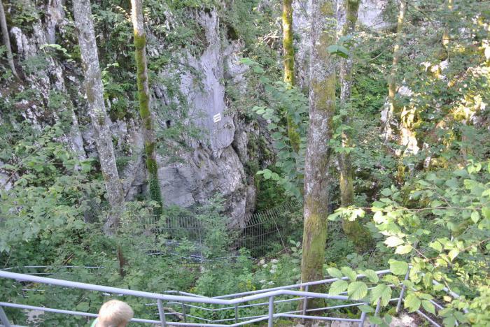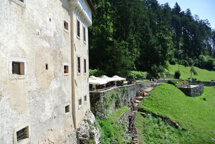 Вместе с билетами получили аудиогиды. Аудиогид – это прекрасная штука. Не зависишь от экскурсовода, не ходишь в толпе, можешь вернуться в места, которые больше всего заинтересовали и вновь прослушать информацию. Итак, Предъямский замок. Он считается одним из самых красивых замков Словении и Европы. Замок расположен у входа в огромную пещеру, в карстовой скале (высота её 123 метра). «Yama» в переводе со словенского пещера, что и отражено в названии.