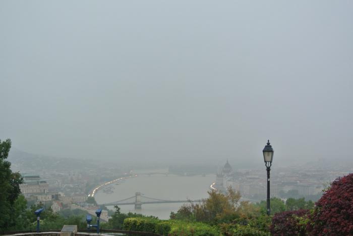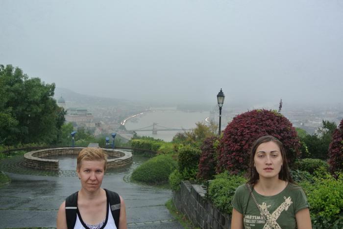 Хорошо, что Саня успел пофотографировать, пока мы шли через мост. Когда дождь стих (но, увы, не прекратился) мы всё-таки поднялись наверх, где нашему взору открылась панорама Будапешта, немного туманная, но всё же, очень красивая.