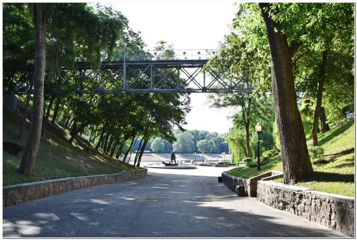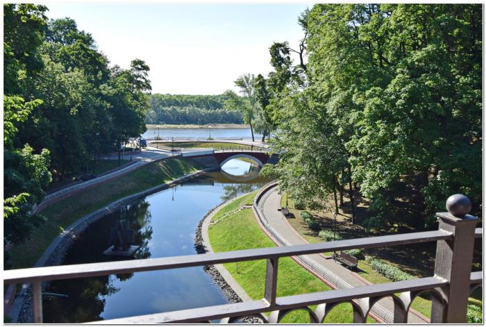Накануне вечером, двигаясь по наитию, мы лишь чуточку продвинулись вглубь парка. Тем не менее кое-что запомнили. Поэтому, прежде чем расстаться с ним, по уже знакомому маршруту выбрались на пешеходный мост через Сож, чтобы по достоинству оценить панораму исторического центра Гомеля, каковым и является дворцово-парковый ансамбль, возведённый на месте доисторического городища.