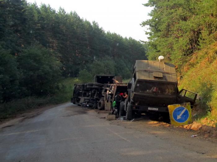 Здесь нам попалась первая серьезная авария, завалившийся на бок КАМАЗ и замученные мужики в ручную перетаскивающие груз в другую машину подошедшую на помощь.