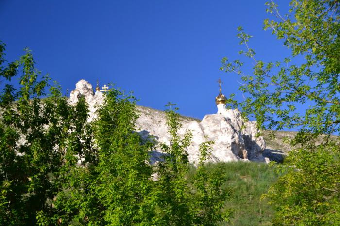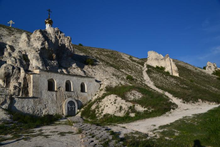 На вершину меловой горы можно подняться. Наверху установлен крест на голгофе, оттуда открываются фантастические виды на монастырь, Дон и вечерние дали.