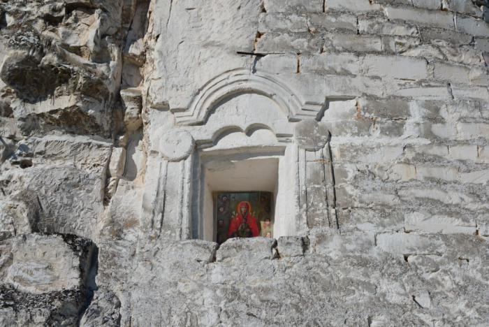 В церкви хранится список с иконы, так как повышенная влажность внутри пещерной меловой церкви не способствует ее сохранности. Да и эта копия заключена в герметичный стеклянный футляр. В последующем в этой поездке мы встречали разные способы сохранения икон. Здесь же гид нам пояснил, что для богослужений монахи из соседнего монастыря приносят все необходимое, в том числе и иконы, чтобы повышенная влажность им не повредила.