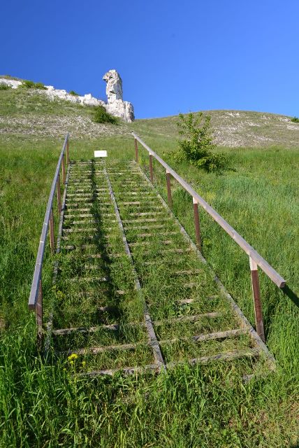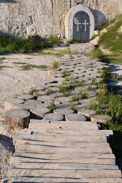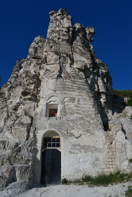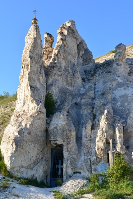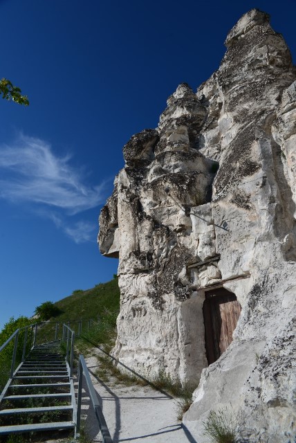 К сожалению, было уже поздно, так что попасть внутрь скальной церкви не удалось. Но и внешний вид сооружения в толще мелового склона с ведущей к ней дорожкой из деревянных чурбачков и плашек вызывает море эмоций.