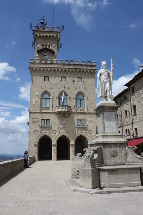 Я проводила мужу экскурсию. Официальное название государства — Светлейшая Республика Сан-Марино. Одна из главных достопримечательностей Сан-Марино — Правительственный дворец или Палаццо-Публико, построенный в 1884 году. Перед Правительственным дворцом расположена Площадь Свободы (Пьянелло или Пьяца-делла-Либерта), в центре которой возвышается Статуя свободы.