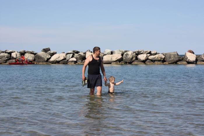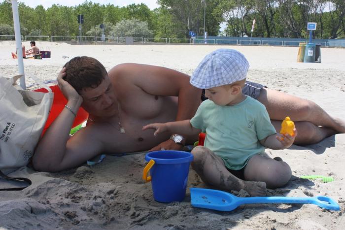 Утро следующего дня обещало, что день будет жарким и мы побежали на пляж. Т.к. в Римини море до волнорезов очень мелкое, то вода очень хорошо прогрелась и ребенок с радостью плескался в водичке у берега. Но если зайти хотя бы по пояс, то ноги сводило от холода!