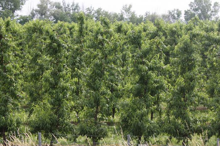 А другие деревья с длинными листочками — это нектарины. Фрукты продают около этих плантаций.