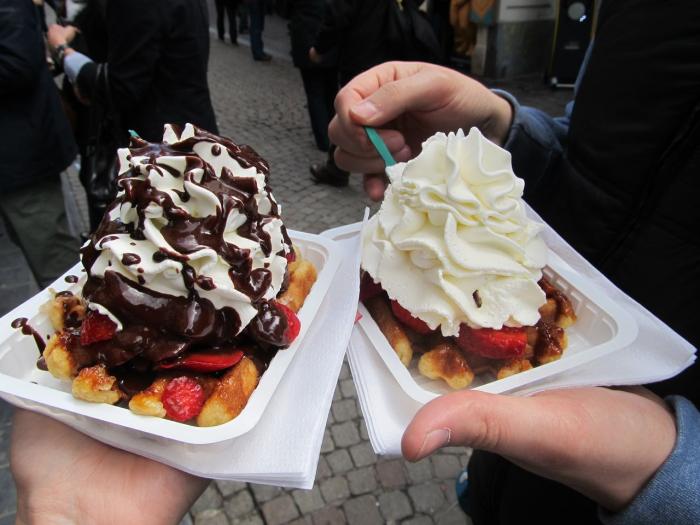 Но не все так грустно в Бельгии, как может показаться на первый взгляд. Очень сильно поднимут Вам настроение… Сладости:) Вафля… Бельгийская вафля — это не передаваемое эмоциональное чувство, это отсутствие возможности остановиться пока не закончится последний кусочек:) И за все удовольствие от 3 до 6€.