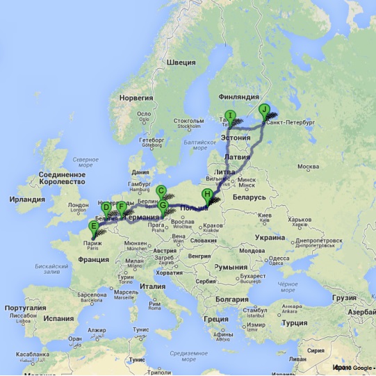 Маршрут: Санкт-Петербург-Варшава-Берлин-Брюссель-Париж-Кельн-Дрезден-Варшава-Таллин-Санкт-Петербург
