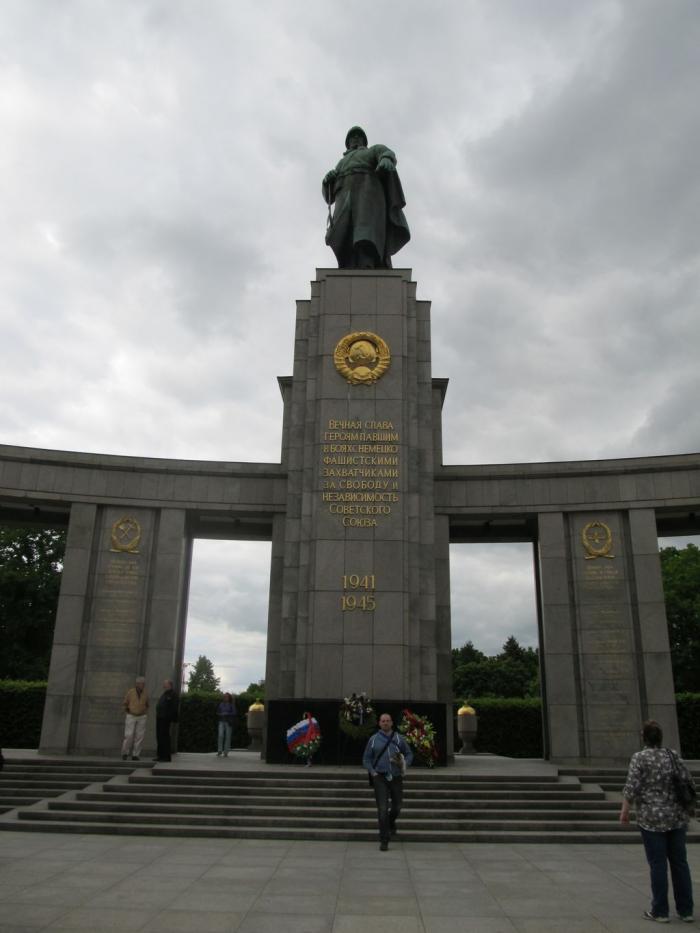 Дальше был рейхстаг, внутрь которого нам попасть не удалось. Для экскурсии в здании немецкого парламента требуется предварительная запись, дополнительная мера безопасности, а посмотреть там есть на что. Хотя бы на подписи советских солдат, которыми был исписаны все стены рейхстага как изнутри, так и снаружи в мае 1945 года (по слухам оставили только приличные надписи). Когда рейхстаг ремонтировался перед переездом столицы Германии из Бонна в Берлин в 90-х, немецкие парламентарии специально постановили оставить часть оригинальных участков стен с подписями, для истории. Чуть погоревав, что мы заранее не позаботились о пропуске и выпив по чашке кофе, мы выдвинулись к памятнику неизвестного солдата.