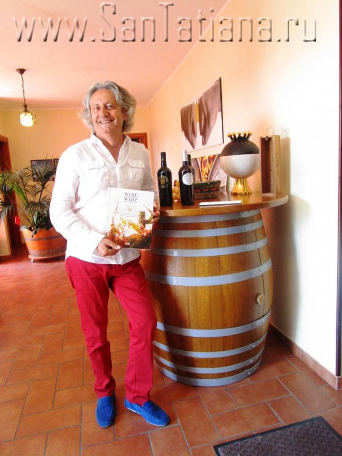 Когда мы вернулись в офис кантины, Рокко вместо дегустации подарил мне 2 бутылки вина. На шум наших голосов выглянул симпатичный моложавый синьор с одуванчиком седых волос. Когда Леонардо сказал, что я — блогер из России и говорю по-итальянски, он начал воодушевленно рассказывать о своей винной философии. Начал он с красного вина ”Perla Nera” (Черная жемчужина), которую назвал инкарнацией любви, как страсти и мучения. Я подумала: настоящей любви по-итальянски! Затем он перешел к белому вину ”Perla Bianca” (Белая жемчужина), которая, по его словам, символизирует вечную, абсолютную любовь. Он рассказал, как проходит дегустация коллекции винософии. Для этого были выбраны 7 лучших вин, которые выражают различные ее аспекты. По его просьбе, джазовые музыканты, написали миниатюры для каждого вина. В полутемном зале звучит джазовая музыка, соответствующая каждому вину. В заключение синьор подарил мне свою книгу «Вино мудрости, вино безумия» с автографом и диск с джазовыми композициями, которые я слушаю, пока пишу эти строки. Я попросила его попозировать, что он охотно сделал с присущим ему артистизмом.