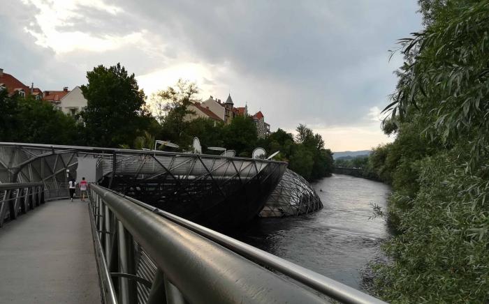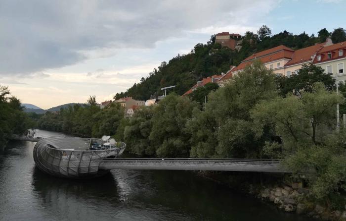 Ракушка Мур Инзель — небольшой мостик с кафе внутри. Практически прямо под нависающей горой Шлоссберга