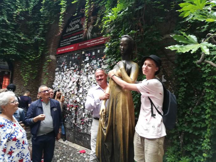 Вот он, «дом Джульетты» с ее балконом, статуей во дворе и лапающими бронзовую девичью грудь мужиками, русскоязычными естественно… Даже думать не хочу что они в этот момент загадывают…