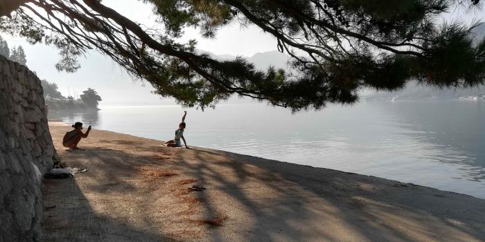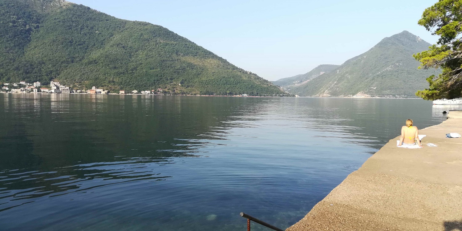 Вот он, пляжик Пераста. Вполне себе подходит чтобы позагорать по утрам и немного поплавать.