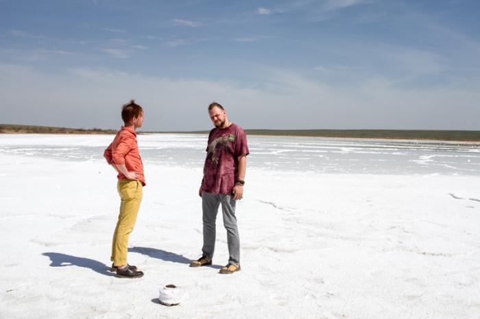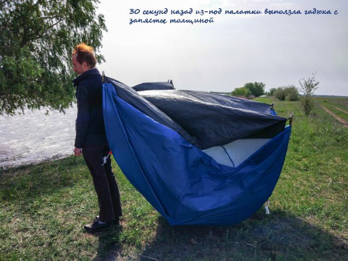 Но были и еще факторы, которые нарушили наше спокойствие. Неподалёку от стоянки мы с Серегой приглядели сухой валежник, за время жизни в степи мы успели соскучиться по костру, а посему пошли дербанить его на дрова, ну, и уже ближе к окончанию процесса из-под этого валежника обиженно уползла черная гадюка. Ладно, отметили в голове факт присутствия и легли спать. Утром Сережа прогуливался вдоль берега и по дороге пообщался с еще трёмя разнокалиберными гадюками, нехотя отползающими с его пути. И это тоже не беда. А вот дальше – очередное везение, поднялся сильный ветер, и когда Серега вытащил палаточные колья, палатку подняло и из-под неё выскочила уже степная красавица, да такого калибра, что хватило бы на обед на троих. Мы так и не поняли, пришла ли она к нему под бок греться еще ночью или заскочила в укромную щель утром, но в глазах Аннике смешалось две мысли – «давайте просто всё бросим и свалим» и «достань канистру и сожги здесь всё в радиусе ста метров». Мы же смеялись до упаду и пытались найти Сережину невесту дабы сфотографировать на память, но её след простыл.