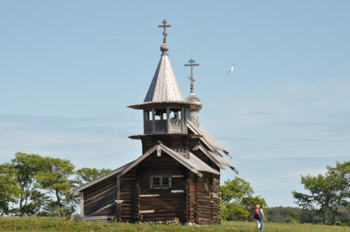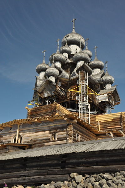 Первое, что бросилось в глаза в этот раз, еще с борта теплохода при подходе к острову – верхняя часть Церкви Покрова Пресвятой Богородицы висящая практически в воздухе – идет реставрация. Церковь подняли домкратами и по мере готовности опускают отреставрированные венцы.