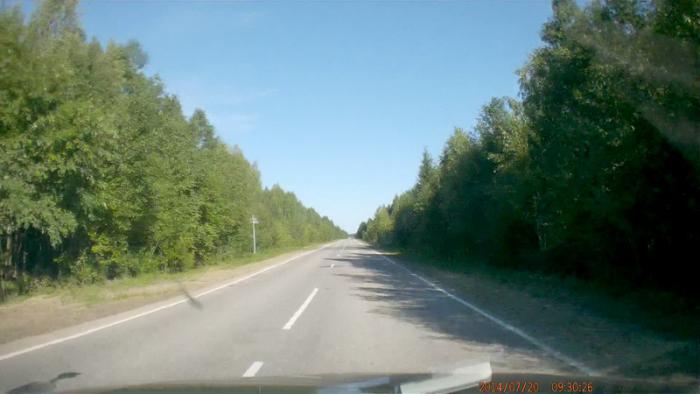 Воскресенье, 20 июля. Опять ранний подъем (06:15), завтрак и в 07:05 мы покидаем Кириллов, заправляемся и минут через 15 выезжаем на дорогу Р-5. Первое, что заметили – практически полное отсутствие машин. За первые два часа пути нас обгоняет одна машина и одну обгоняем мы. Еще с десяток машин попадаются на встречу.