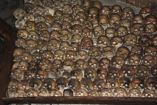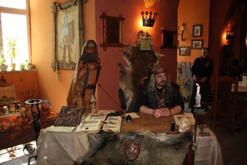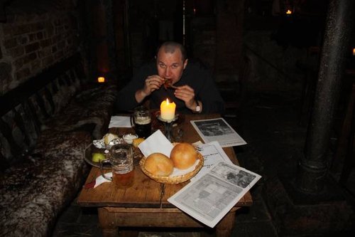 Сам ресторан довольно большой и представляет из себя четыре зала трамваем, в двух из них потолки украшены черепами, есть камины, и во втором зале стоит жаровня, где на медленном огне томится мясо и картошка. Негромко и равномерно звучит удивительно красивая средневековая музыка, почти все композиции я ни разу не слышал. Музыкальное сопровождение усиливает погружение в средневековье, не хватает только собак, о шерсть которых мы бы вытирали руки :).