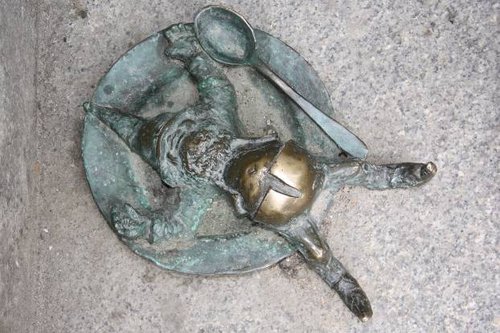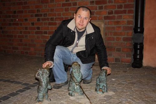 Потом гномов полюбили туристы, и стали их коллекционировать, ну не самих гномов, конечно, а их фото. Ведь интрига в том, что уже никто толком не знает, сколько же гномов нынче обитает во Вроцлаве, многие агентства и рестораны начали выпускать карты с месторасположениями краснолюдыков, вот именно с такими картами не смыкая глаз и носились мимо нас многие туристы, фотая по ночи найденных гномов.