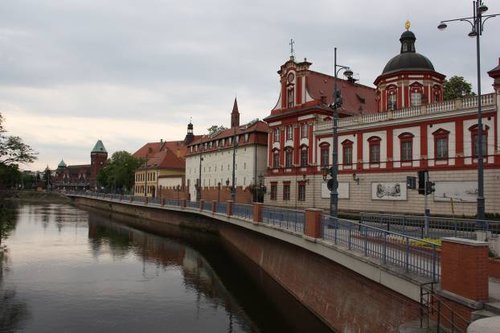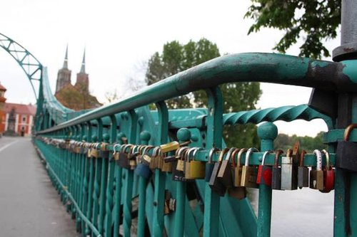Остров очень плотно насыщен достопримечательностями, к ним, наверное, можно отнести и мосты на него ведущие, особенно Пясковый, который своим красным цветом вызвал у меня ассоциацию с чем по пожарным, ну и Тумский, густо увешанный замками влюбленных. Кстати, мостов во Вроцлаве больше двух сотен.
