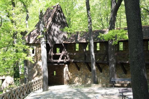 На входе перекошенная избушка на курьих ножках, и дедушка через крохотное окошко берёт мзду с любопытных. Просто погулять по парку и покормить рыбок в пруду, обойдётся в 2 злотых, а вот побродить по самому замку уже десять. Замок представляет собой почти чёткий квадрат с большим и красивым внутренним двором, и так же очень симпатичными, но разными, башнями по углам этого квадрата. В парке, естественно, для туристов отметили пару деревьев и сделали надпись, что обойдя их по кругу три раза вы гарантированно получите исполнение любого желания. Мы, естественно, намотали кругов по девять, ну чтобы с запасом и на всяк выпадок.