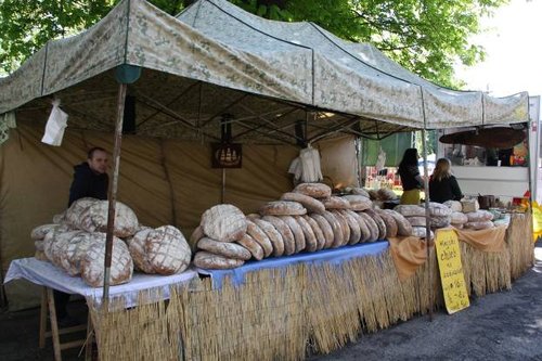 Наше недоумение возросло ещё больше. Благо, что проходимость у Murano позволяет обходится частенько без дорог, хотя какие дороги в поле? В итоге, мы воспользовавшись ложбинкой, по которой многие не рисковали ехать, и подъехали к замку максимально близко, припарковавшись в траве у дороги. А по самой дороге полиция никого не пускала, потому что весь асфальт уже представлял собой рыночный ряд. И все подходы к замку также превратились в одну большую ярмарку. Здесь буквально яблоку негде было упасть. Сплошная вакханалия обжорства, десятки лотков и прилавков с огромными хлебами, сырами, мёдом, мясом и т.д. очень редко были вкрапления чего-нибудь промтоварного а так сплошные продукты. Причем продуктами не фабричными, а как бы сельский вариант, наверное, это выставка каких-то малых хозяйств и хуторов.