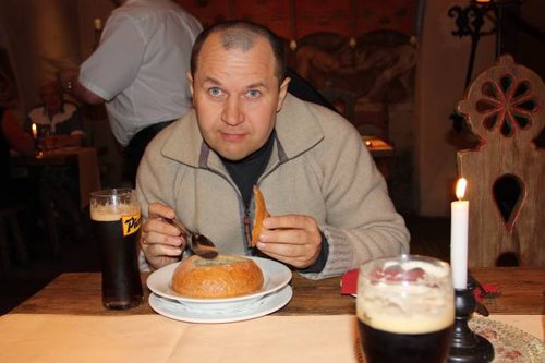 Официанты (те, что в возрасте) ещё немного помнят по-русски, но меню на великом и могучем отсутствует. Конечно, сразу заказали себе звезду программы — *журик*, а так как проголодались к вечеру изрядно, то и ещё всякой всячины на пробу. И в общем-то не зря, *журик*, конечно, вкусный, только вот порция оказалась маловата, его подают в хлебе, паляниця почти стандартного размера вычищена изнутри, а вот сам журик занимает в ней наверное не больше половины.