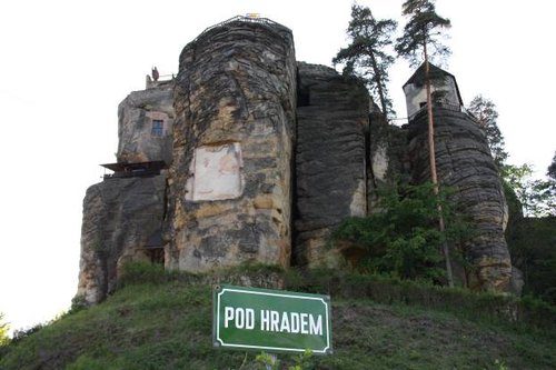 Sloup (skalní hrad): 50° 44′ 8″ N, 14° 34′ 50″ E, — это средневековое поселение на вершине небольшой горки, которая по форме напоминает пасхальный кулич, правда, некоторые дома подгрызают этот кулич и снизу, ну а в целом форма поселения необычная, поэтому и едем. Добрались мы к Скальному граду в полшестого, и узкую деревянную лестницу, ведущую на самый верх, уже заперли. Здесь рады туристам до пяти, так что довольствовались осмотром только снаружи.