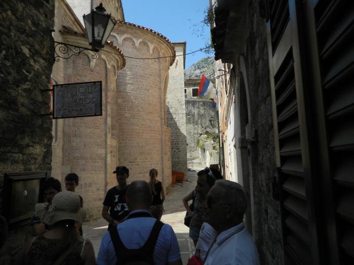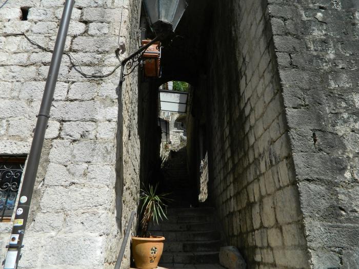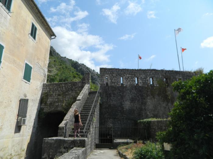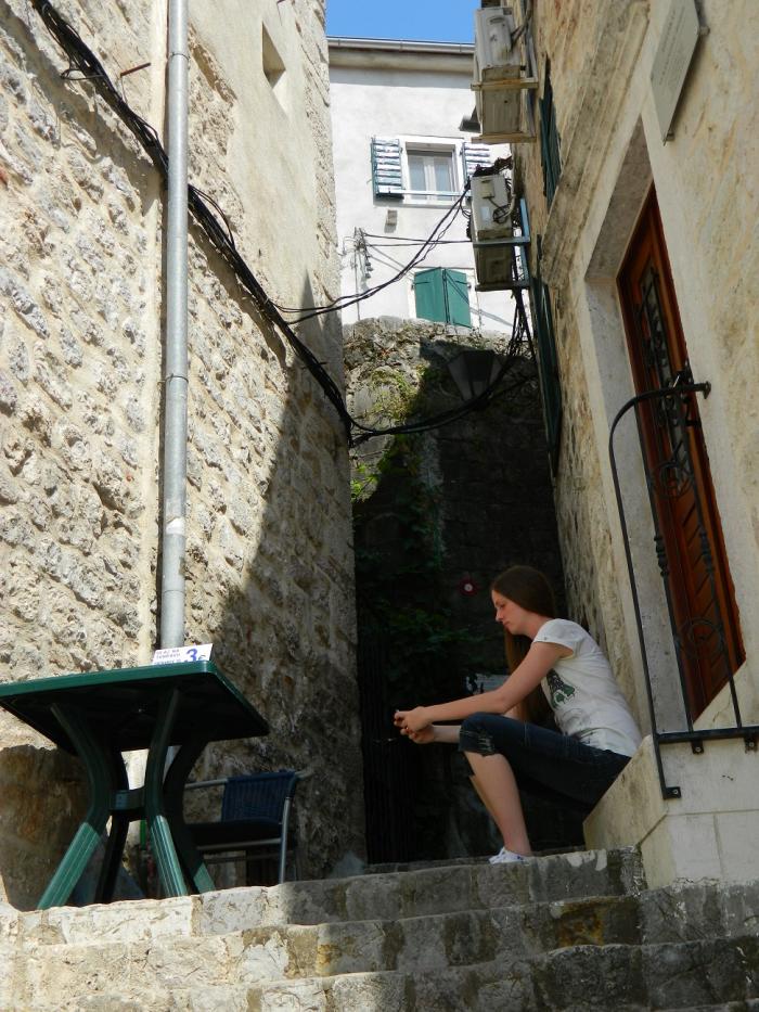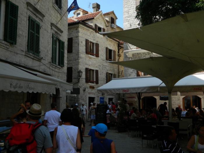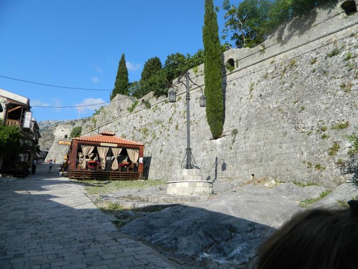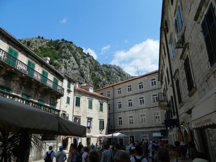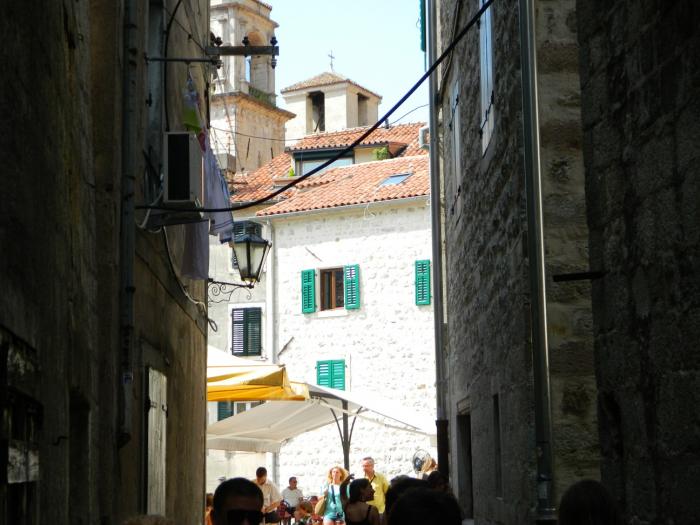 В городе скорее ищите парковку, коих здесь множество, оставив машинку за 40 руб час. бегите изучать старый город Котор)Там очень «олд-скульно» и самое главное это полностью живой и функционирующий жилой район с развешанным бельем на балконах, — в узких улочках, растущими апельсинами на крышах домов, и отдыхающими местными жителями в закоулках. Внутри города, в это время было много групп туристов итальянцев, с того самого лайнера, прибывавшего в заливе. Под итальянские разговоры мы не торопливо прогуливались по городу,-заходили за каждый дом, боясь пропустить из вида фотообъектива ещё какую-нибудь интересную улочку)Поднявшись на стену города, можно рассмотреть крыши старого Котора, а если вы ещё не устали(чего не скажешь о нас), то можно подняться по каменной лестнице в горы, — к крепости святого Ивана преодолев 1400 ступенек, за что получите удовольствие от красот на южного фьёрда Бока-Которска с высоты 280 метров! В следующий раз мы обязательно поднимемся, а всем кто ещё не был, советую!!!