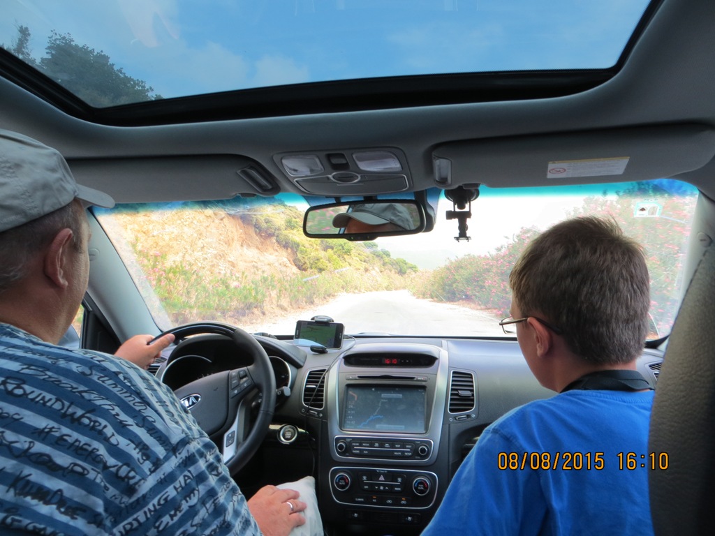 Купались мы купались… купались-купались… В итоге, как не охота было оставаться, но поехали обратно. Навигаторы показывали несколько вариантов, конечно мы выбрали самый короткий! 63 км… вместо 67. По выезду из Палеохоры… повернули налево… и…