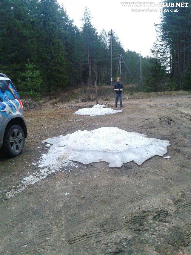 Довольно много снега для мая. Темнеет, мы пробуем разведать очередную стоянку обозначенную на карте, но утыкаемся в деревню, которая еще и очень богато застроена по побережью. Грустим, но не отчаиваемся, увидели небольшую колею в лес, идущую вдоль озера – попробуем. Колея закончилась у очередного строящегося «фешенебельного домика на берегу» но ниточка следов есть и дальше. Едем. Ух, какой холмик, для недопривода сложно преодолимый, но Йети должен справиться, дальше чуть грязная тропа через лес, хороший спуск и вуаля, хорошая полянка на берегу Валдая с видом и без снега. Прекрасно.