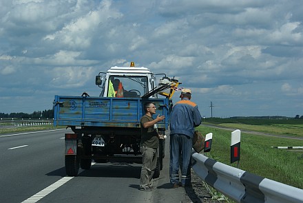 На следующий день, Маша снова демонстрирует чудеса женской невнимательности: вначале умудряется заехать в Минск, где в пробках мы теряем час времени, а после — внимание! наш фирменный финт!- обсохнуть на трассе. Это, видимо, ее коронный номер и он повторяется в каждой нашей поездке. К счастью, помощь, в виде хмурого тракториста, приходит скоро. Остаток пути проходит без приключений, но дорога расслабиться не дает — видим довольно частые аварии с участием фур. Причем, абсолютно на ровном месте.