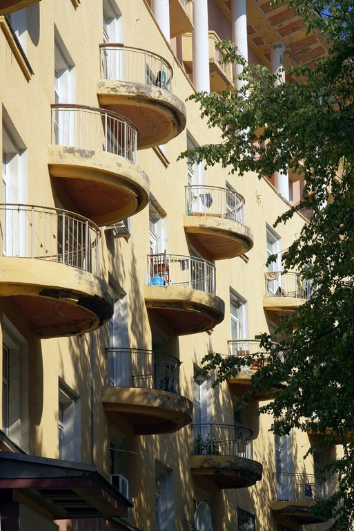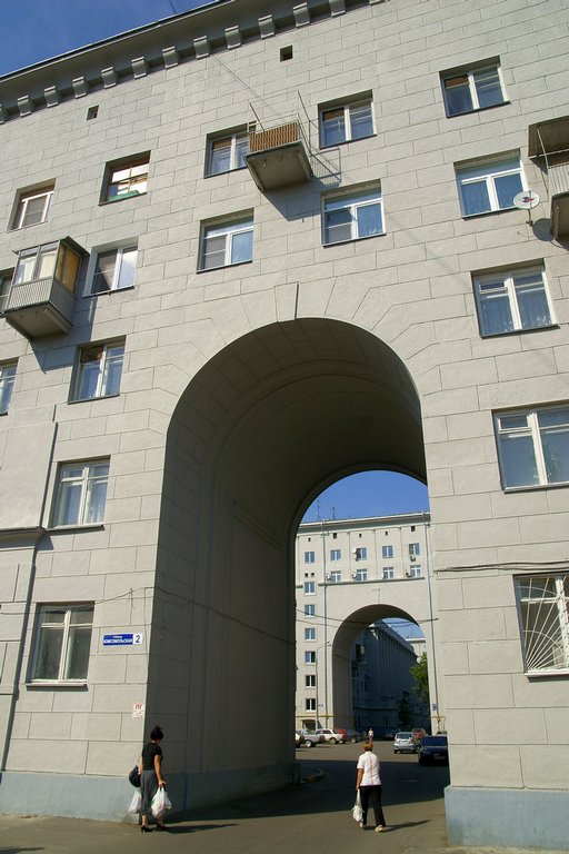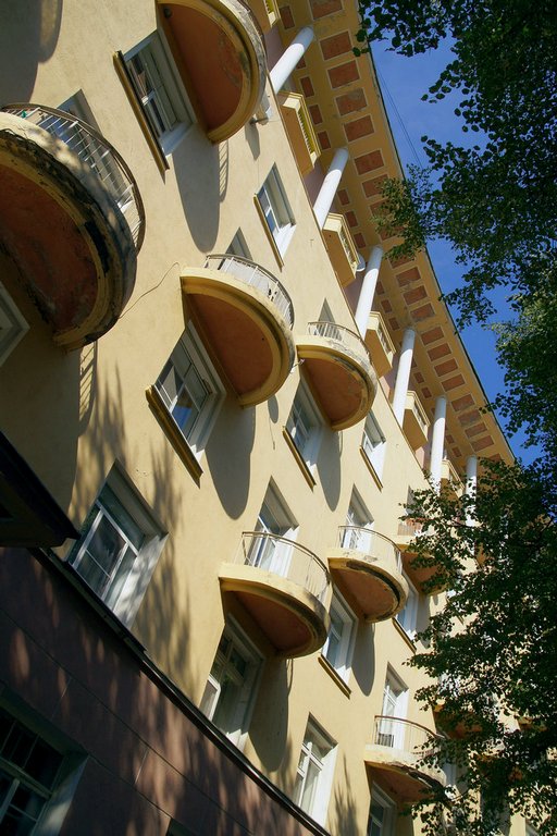 На патриотическом подъеме, закупив значков и открыток, мы отправились смотреть соцгород. Точнее те дома, которые сохранились с 1936 года. Оказывается, строили по американским проектам, и спустя 70 лет есть чему подивиться.