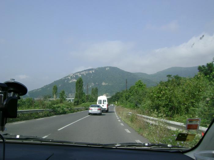 Проехав Предял и Азугу мы попали в плотнейшую пробку. Дорога одна, справа слева горы, никаких объездных путей, время полдень, температура около 30-ти. За час проехали около 13 км. Полиция активно разруливала ситуацию, но похоже безрезультатно. Позже мы поняли, что причиной является грузовой транспорт, вливающийся где-то ниже в общий поток.