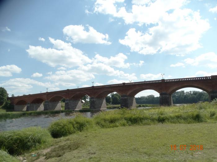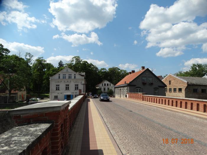 18 июля нам предстоял переезд в Вентспилс. По дороге мы решили посетить город Кулдига. Кулдига расположена в месте, где в реку Вента впадает небольшая речка Алекшупите. Город часто называют «латышской Венецией», так как в историческом центре многие дома расположены у самой воды. Одним из символов города является старый кирпичный мост, построенный в 1874 году. Это самое длинное сооружение такого типа во всей Европе. Мост состоит из 7 пролётов.