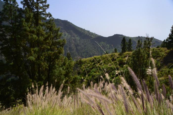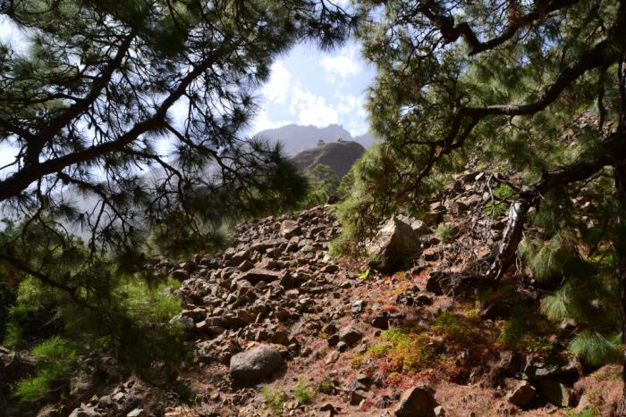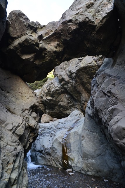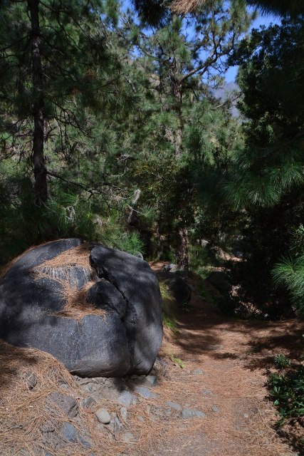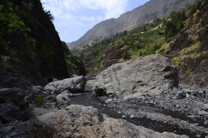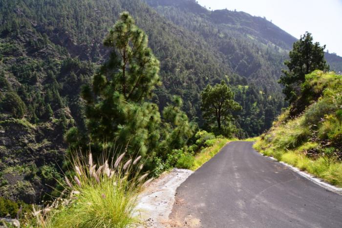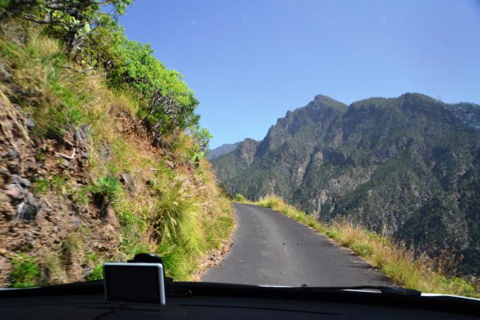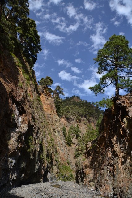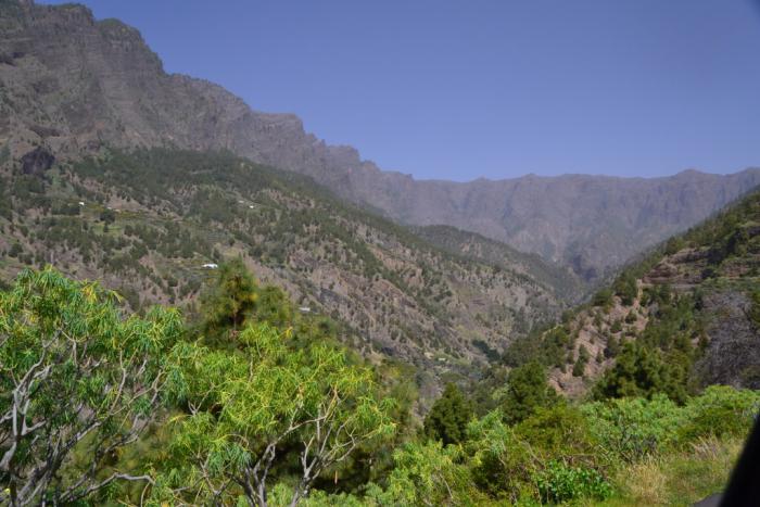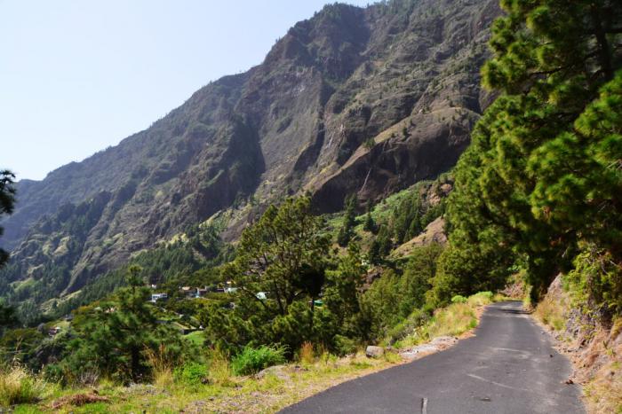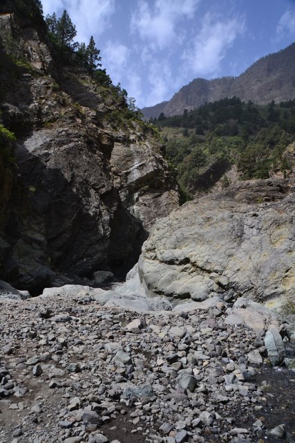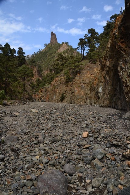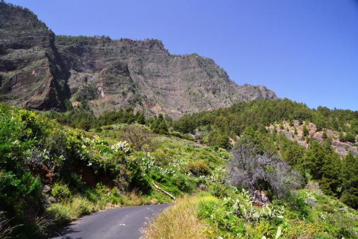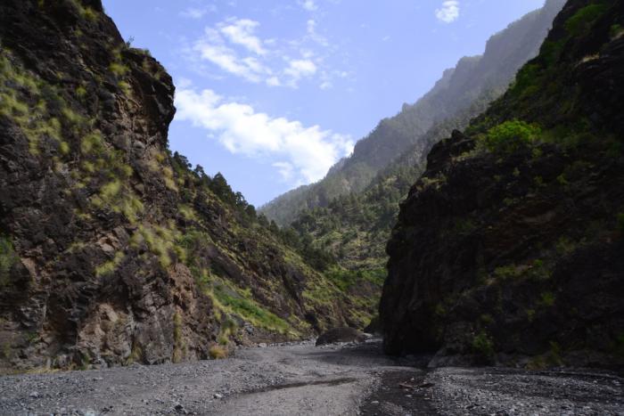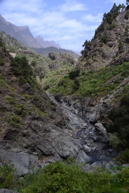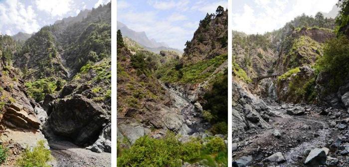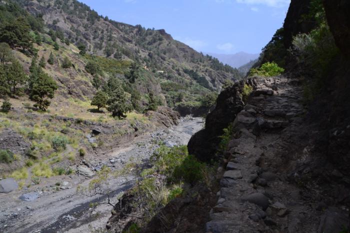 Первый раз мы продолжили движение по LP-214 и через полувысохшее русло ручья переехали на противоположную сторону ущелья. Во второй раз оставили машину на парковке и по пешеходной тропе вдоль ручья отправились по барранке до кальдеры.
