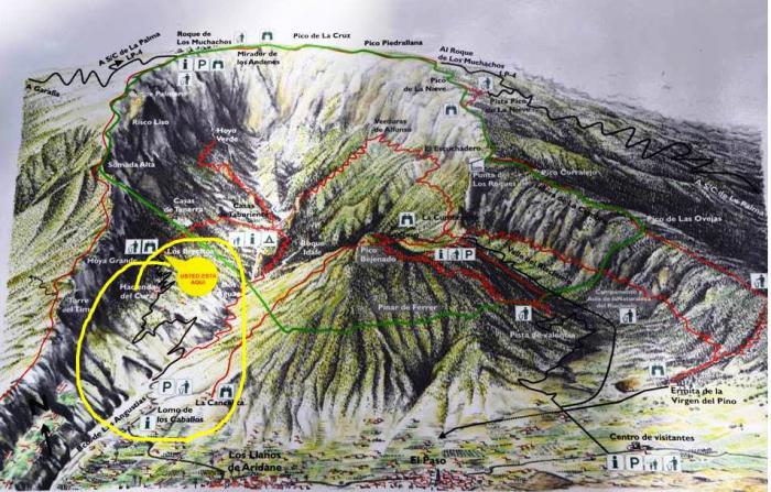 С кальдерой Табуриенте со стороны смотровой площадки Кумбресита мы познакомились в прошлой части отчета о Ла Пальме. Теперь попробуем дойти до кальдеры со стороны барранко (так называют ущелья-овраги) Ангустиас. Актуальный для этой части рассказа участок выделен желтой линией: