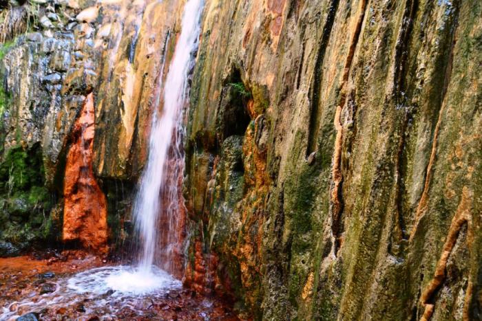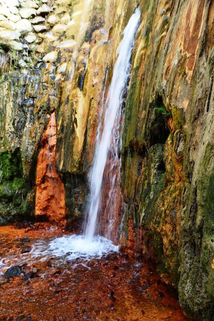 Водопад действительно цветной! Такого разноцветного источника мне еще не доводилось видеть: желтые, оранжевые, зеленые краски образуют радужную живописную палитру.
